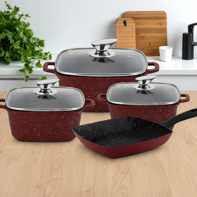 Набір квадратних кастрюль і сковорода 7 в 1 гранітне антипригарне покриття з прозорими кришками для приготування їжі