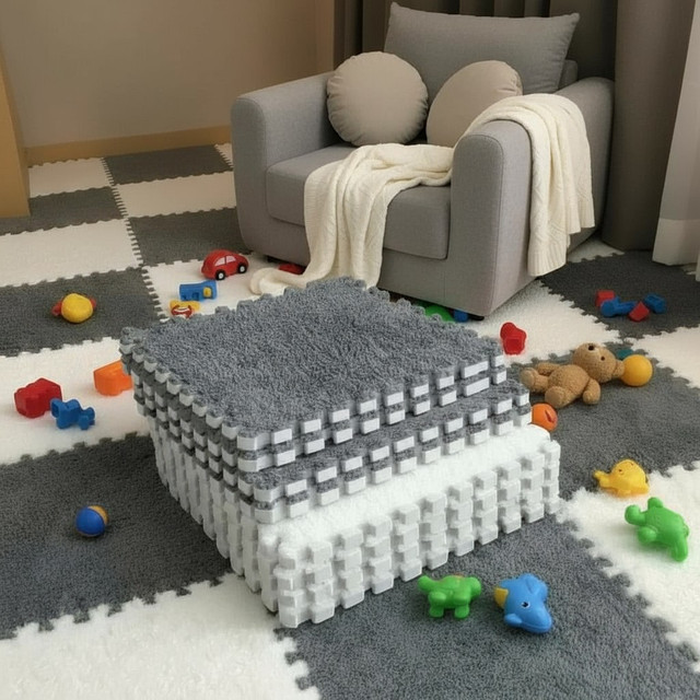 Килимок-пазл з плюшевим покриттям створює безпечну й теплу ігрову зону для дітей, захищає від холодної підлоги та амортизує удари. Пазлова структура дозволяє зручно змінювати розмір і форму покриття відповідно до потреб. Матеріал легко чиститься та довго зберігає м’якість, гарантуючи затишок і комфорт малюкам.